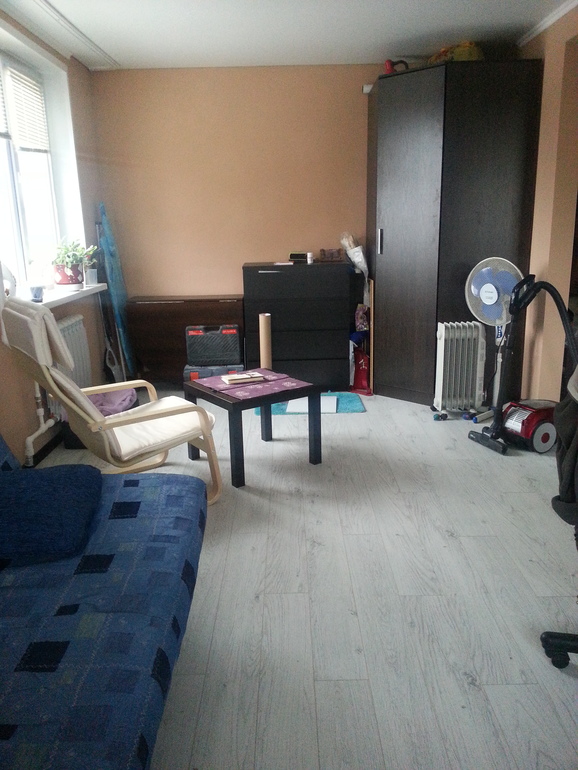 тут все отрицательные отзывы хотя видно же что ремонт не закончем врядли в обычной жизни у вас куски обоев и инструменты в комнате находяться, но когда вы делали ремонт видно подходили с душой. Если финансы поджимают вариант выхода из ситуации пушистый ковер под цвет стен, текстиль на окна и диван а также на кресло около маленького столика. Стена где комод и стол требует фото семейных в темных рамках. У вас сейчас видно еще последствия ремонта инструменты и лишние вещи если это все убереться то станет довольно уютно