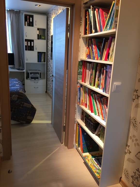 Раньше стоял в детской, а сейчас в коридорчике между спальней и детской. И вроде бы и удобно и ему в этом уголочке, и нам.Мебель в детской и спальне белая, этот стеллаж тоже белый, а двери - беленый дуб (вроде бы). Когда дверь в спальню открыта - все нормально, а когда закрыта - смущает цвет.
