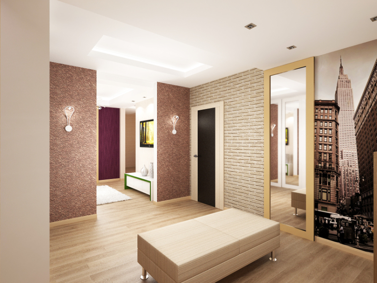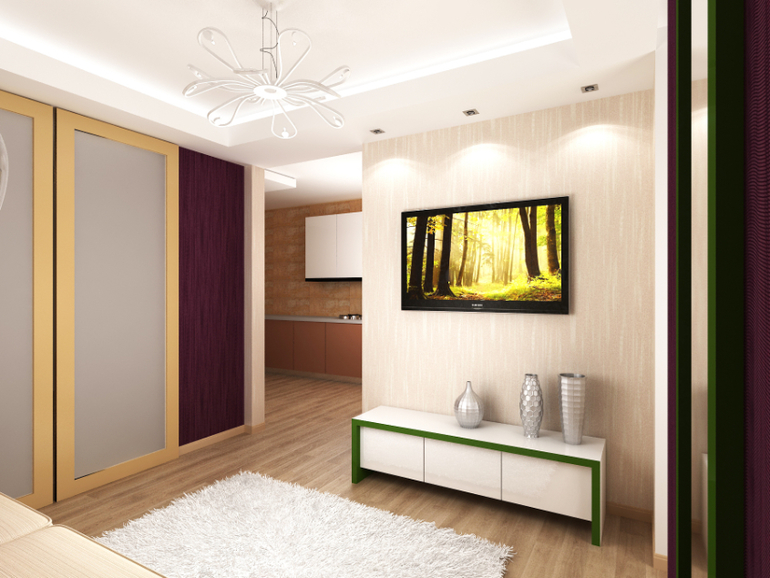На чертежах видно, что ванная за счёт площади холла увеличена практически в полтора раза. Просторный холл максимально использован для хранения вещей. Из холла мы попадаем в зону гостиной, которая объединена с кухней.