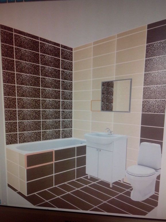 Интерьерное решение ванной комнатыОчень долго выбирала плитку, то на складе нет,то коллекция устарела. В итоге на следующей неделе прибудет Атлас Конкорд Дизайер, на которой остановилась. Ванная комната маленькая(1,7 на 2 ). Одна стена(от входа справа) закруглена,на ней будет бежевая мозаика. Еще есть ниша над унитазом.Я разложила плитку,нишу сделать не удалось.Примерно так выглядит (фото под катом). Сомневаюсь правильно ли выложить всю стенку над ванной коричневой плиткой с завитками(это не декор)? Девочки,выручайте. пробовала раскладывать полосками,рамками. Вообще плохо смотрится.Сверху будет натяжной потолок. Вся плитка будет отцентрована.