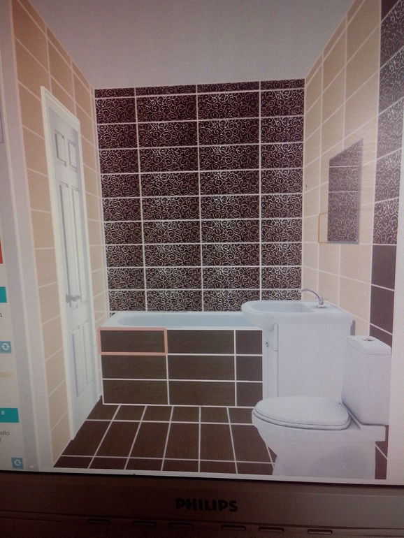 Над унитазом это у меня как бы ниша (не получается в программе сделать ее)- с двух сторон коричневая плитка и задняя стенка в завитках. Плитка с завитками -не декор (у них в коллекции есть и декор наподобие,только завитки крупнее). Пол можно светлый. Меня только вот эта стена над ванной смущает-не перебор ли? Хотя еще шторкой будет закрываться. Может и правда 2 столбика выложить?