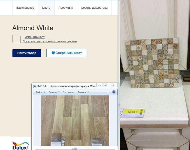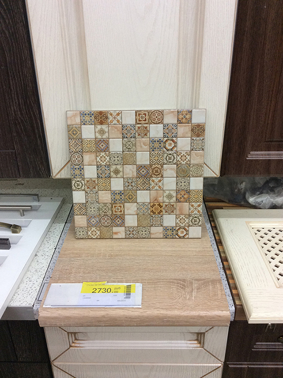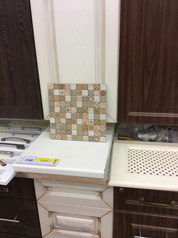 Очень понравилась плитка на фартук, самая первая в бежево-коричневых тонах. Но потом встал вопрос по поводу цвета стен, и мне стало казаться, что все это будет блекло-невзрачным. Задача сделать кухню светлой, но не бесцветной :)
