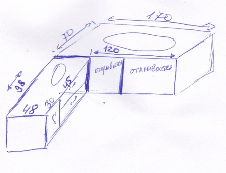 Под раковиной должен быть шкаф с выдвижными ящиками и левее 1 распашная дверца (там будет бак с грязным бельем).