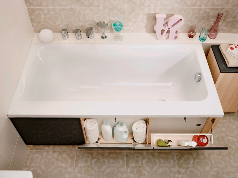 Экран под ванной должен открывать двумя откидными дверцами. Типа этого: