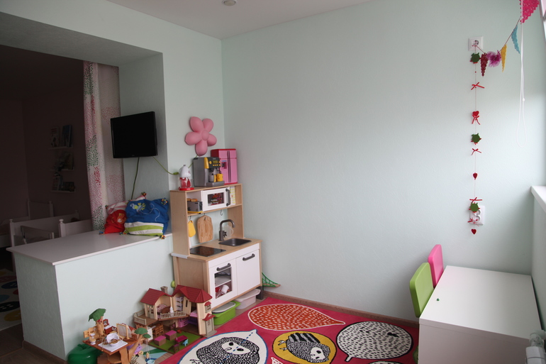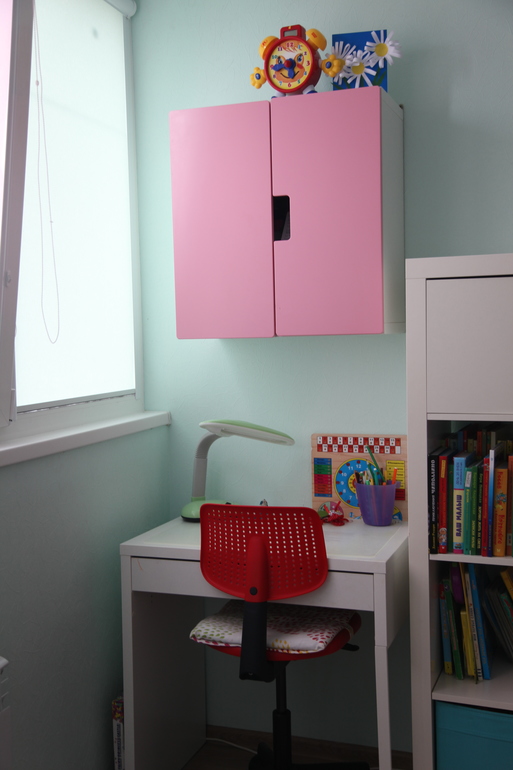 = Под окошком тоже можно какой-нибудь бордюр сделать, может даже с помощью наклеек для интерьера. И таким образом объединить интерьер стены.= Мне не очень нра... идея расстановки на лоджии всё вдоль стен, рассмотрите как вариант — место для младшего сделать более мобильным: его стол можно поставить ближе к кухне (игровой), за столом пить чай и пробовать приготовленные блюда, кухню переставить к стене слева от окна, а саму стену стилизовать для кухни: может сделать её яркой — желтой или оранжевой, такого сочного цвета, или бордюрчик прикрепить, или оформить шторами как Вы хотите — и вот у этой стены установить кухню и домик.= теперь по стене справа от окошка, над шкафом можно оформить пространсво и так: