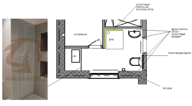Думаю сделать частично стены плиткой, частично покрасить. На картинке схема с/у.