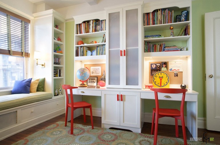 , по стене с Русалкой большой стол, чтобы 2 ребенка могли одновременно сидеть. Собственно к столу и вопросы ) Хочу не просто стол, а вместе с шкафчиками/полочками. Очень нравится вот такой вариант: