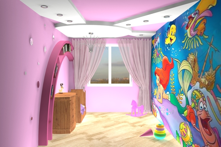 Метраж 13 метров. Есть встроенный шкаф слева от дверного проема. Шкаф-купе со стеклянными дверьми бело-розово-фиолетовой гаммы (под цвет комнаты, в общем). Он остается точно. Очень хочу оставить потолок. Обои с Русалкой планирую переклеить, с радугой готова распрощаться, тк много пыли на ней оседает. Детская кровать и комод уйдут однозначно, как и вторая кровать, которая стоит сейчас по стене с Русалочкой.