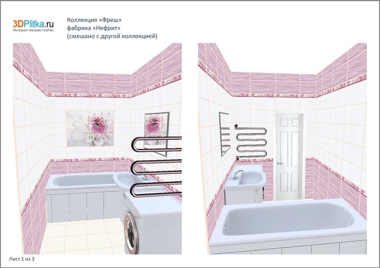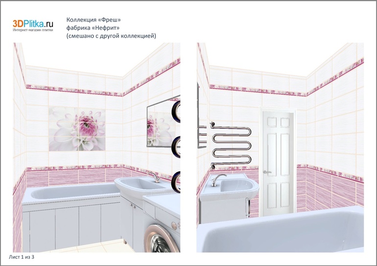 Мне сына вариант нравится больше, даже не смотря на то что слегка уменьшает объем комнаты.А если взять Ваш, то убираем верхнюю лиловую полосу однозначно, и как-то в вашем варианте больно высоко нижняя часть проходит лилового, хотя понимаю что по черте машинки и раковины, но над ванной это полоса лишней смотрится. У мужа забраковываю верхний лиловый цвет. На крайний случай оставляйте только низ лиловым и далее до потолка белый.А если честно, то и цветочки убрать, они года через два надоедят.