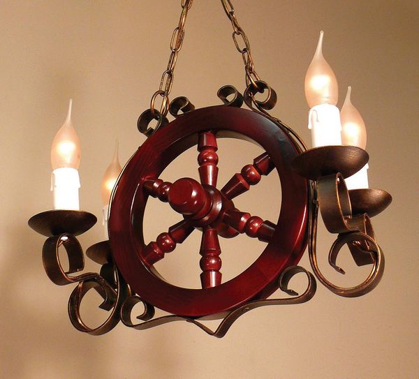 Как вариант оставить в покое люстру, думаю она смотрится тоже стильно, а дополнить  в ее поддержку декоративными элементами, где присутствует черный цвет ваш интерьер. Подушка или флаг с веселым роджером, подушки — "тельняшки" (полосатые черно-белые), или просто подушки в узоре которых присутствует черный цвет. 0af2c6634754f2b671ca4cfb4a2a2e03.jpg 14e17132b71d90939fae98b392a7f62b.jpg (синий заменить на черный) 46a48809c64df31099fb452eb2dfaab1.jpg be9070c27b2e9d23792f548925d798a1.jpg afdcae23df073af5fcc2dffb8224af87.jpg  df5fd030e7f2acdffd791a4d417c3b1c.jpg (просто черная полоска и уже увязка будет) 8fbeb4a3f44b73885a4426184ff88148.jpg (картина на стене черно белая графика) d59c7a0929553bbdd9715f171ed35a44.jpg (если какой-то коврик или половик то очень стильно можно  чередуя на основном фоне например и коричневатую и черную полоску, увяжете и с вишневой мебелью и с черной люстрой).Картины графика черно- белая, пиратскую карту состаренную опять же решенную графично. Вариантов масса. Много черного не нужно, несколько акцентов. бинокль, сундук, якорь — подушка. Вообще неплохо бы было в декоративных элементах, чтоб присутствовал и цвет вишни и черный. тогда вообще все как по маслу будет.Если декорировать люстру, чтоб увязать с мебелью, первое что приходит на ум это покрасить сеть в цвет гармоничный с вашей мебелью — , цвет вишни и немного "опутать" ей люстру))