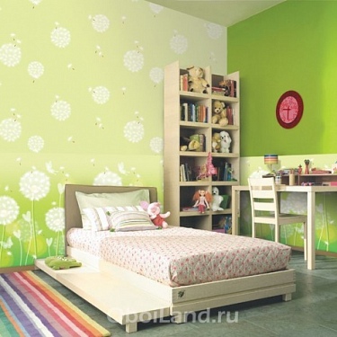 2. Вариант. Это корейские обои. Шинхан. Что то мне прям нравятся одуванчики, но может для мальчика они не очень подходят. К эти обоям есть бордюр метровой высоты, на фото он виден. Можно как акцент просто одуванчики сделать. А остальные стены зеленые, как фон у одуванчиков.