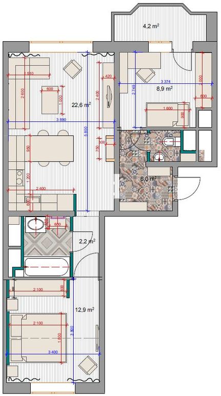 Накопили мы денег и, добавив их к военной ипотеке, купили маленькую двухкомнатную квартирку, общая площадь 56м2. Опыта в покупке квартир у нас нет, это первое наше серьёзное приобретение. Долго искали квартиру со свободной планировкой и линейку...в итоге нашли распашонку, в которой практически все стены несущие))) Но я, как архитектор, не могла позволить себе не суметь что-то с этим придумать. Благо, муж полностью отдал всё в мои руки, настояв только на плитке в ванной и обоях в спальне)Квартира новая, бетонные стены и пол с торчащими крюками от плит. Начинать было страшно, но глаза боятся, а руки делают!