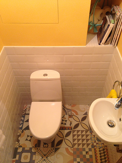 Нам повезло иметь 2 санузла. Поэтому решили один сделать гостевым, с унитазом и маленьким умывальником, а второй получился с ванной и стиральной машиной. Гостевой получился очень радостным) Плитка на полу заходит из прихожей, стены очень хотела покрасить, но в итоге выложили плиткой до середины.