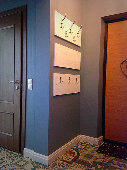 Прихожая. Покрасили стены в мой любимый цвет) Купили в Леруа 3 доски и крючки. Приделали к стене, получилась вешалка. Сейчас там под ней уже стоит полка для обуви с сидением из Икеи.