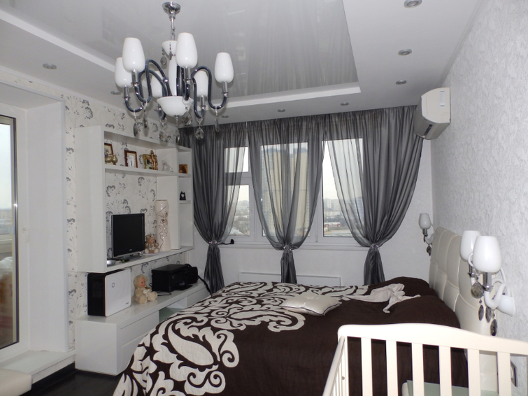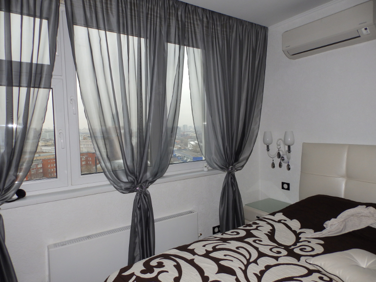 -спальня. уже была римская штора, сделанная ранее, поэтому добавили только тюль- полуорганза, стального цвета, с декоративными шпильками-подхватами.