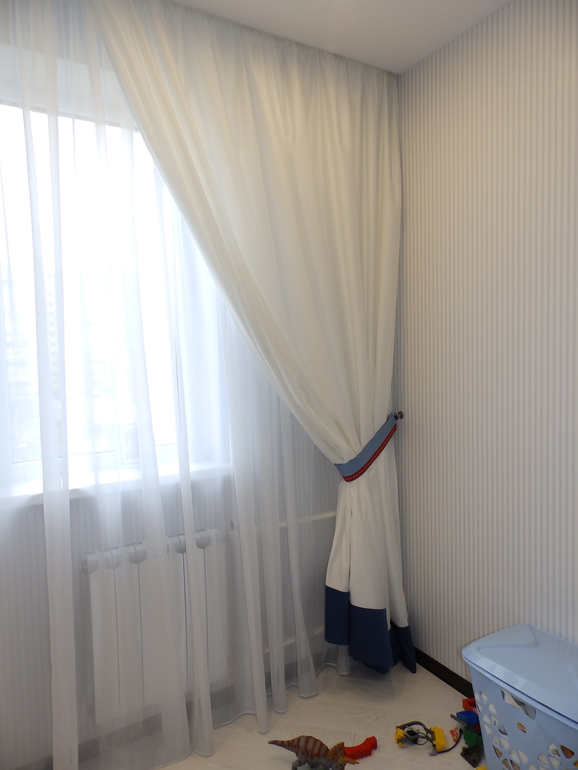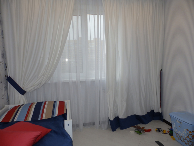 -детская в морском стиле. портьеры и покрывало - смесовый хлопок, матовый, плотный. портьеры с отделкой широким кантом по низу, контрастного синего цвета из тканей -компаньонов. покрывало на подкладе, без стежки.подхваты для штор - двухсторонние.