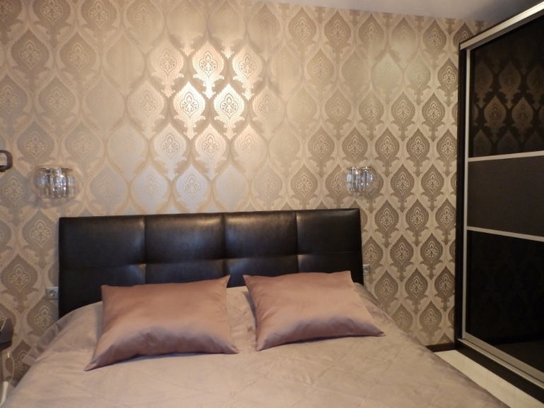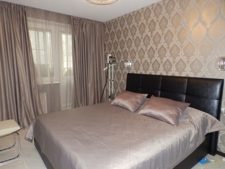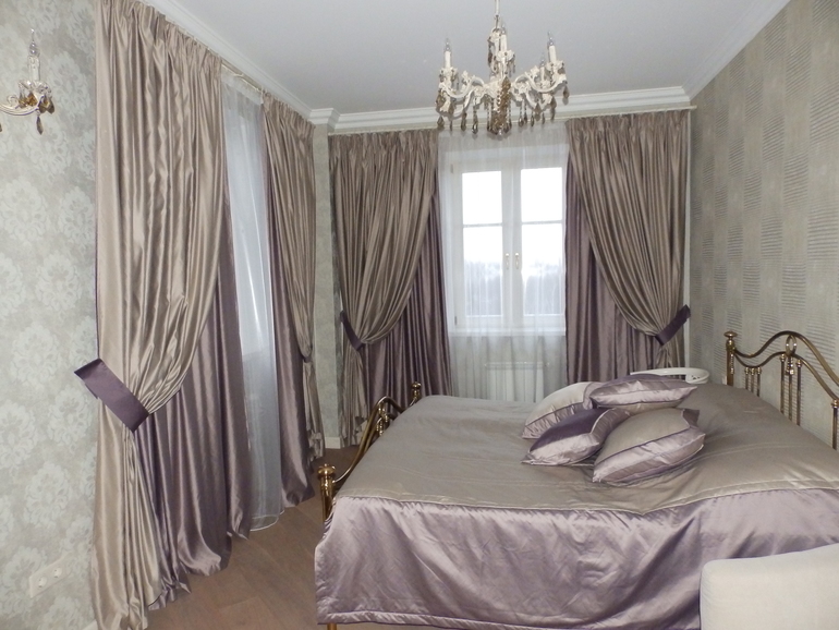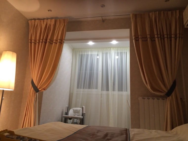 -спальня. портьеры - уплотненный атлас, с уменьшенным проблеском. тюль- тонированная уплотненная жатка. покрывало со стежкой по основной части, на подкладе.