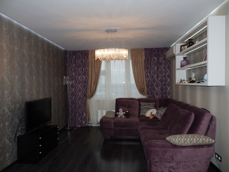 -гостиная. двух-рядный карниз. портьеры с декором- внутренняя отделка образует зрительный подшторник. портьеры- основная часть- плотная ткань с выделкой "кружево" и классическим рисунком. тюль- вуаль молочного цвета.