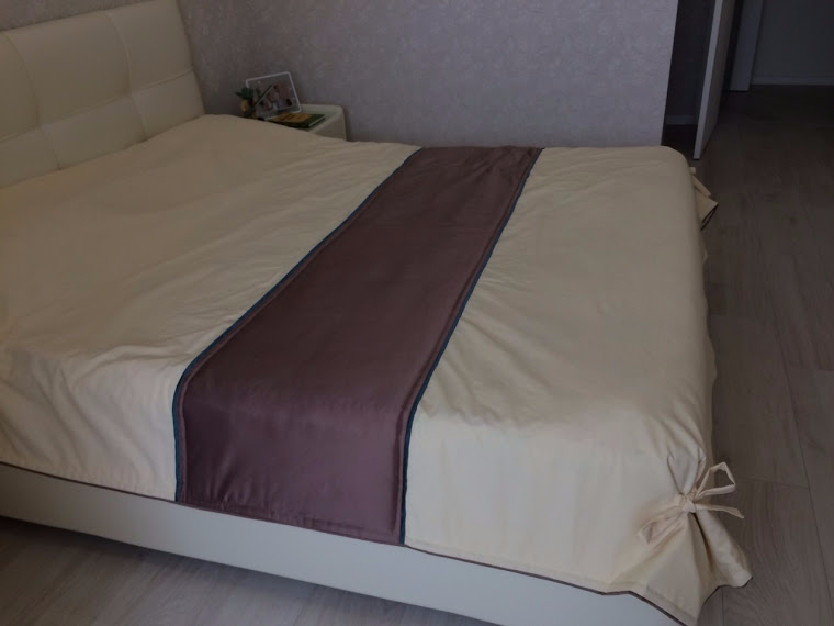 покрывало с декоративной отделкой, без стежки. основа - хлопок в тон портьерам, на подкладе.