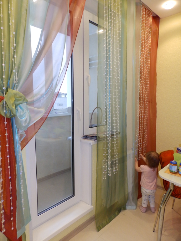 -кухня. т.к. характер всему помещению задает люстра, то и декор окна - яркий! 6 полотен цветной полуорганзы, что бы можно было без проблем пользоваться балконом и по разному драпировать цветные ленты. карниз потолочный, скрытый в нише. профильный. и нитяные шторы с бусами , три части, в качестве декора.