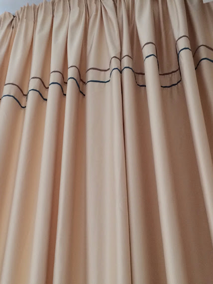 -детская в морском стиле. портьеры и покрывало - смесовый хлопок, матовый, плотный. портьеры с отделкой широким кантом по низу, контрастного синего цвета из тканей -компаньонов. покрывало на подкладе, без стежки.