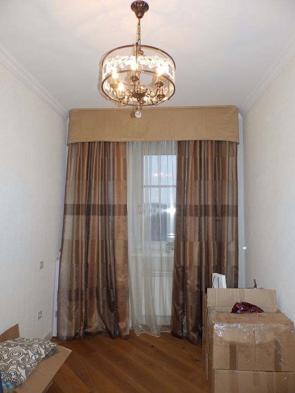 прямой и лаконичный ламбрекен-бандо. трех-рядный скрытый профильный потолочный карниз. портьеры- уплотненный тюль на подкладке из ткани, которая использовалась для ламбрекена. тюль- тонкая мягкая прозрачная органза.