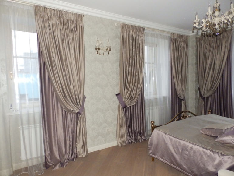 -спальня. двух-рядные декоративные карнизы. портьеры двухслойные атласные. тюль -органза.