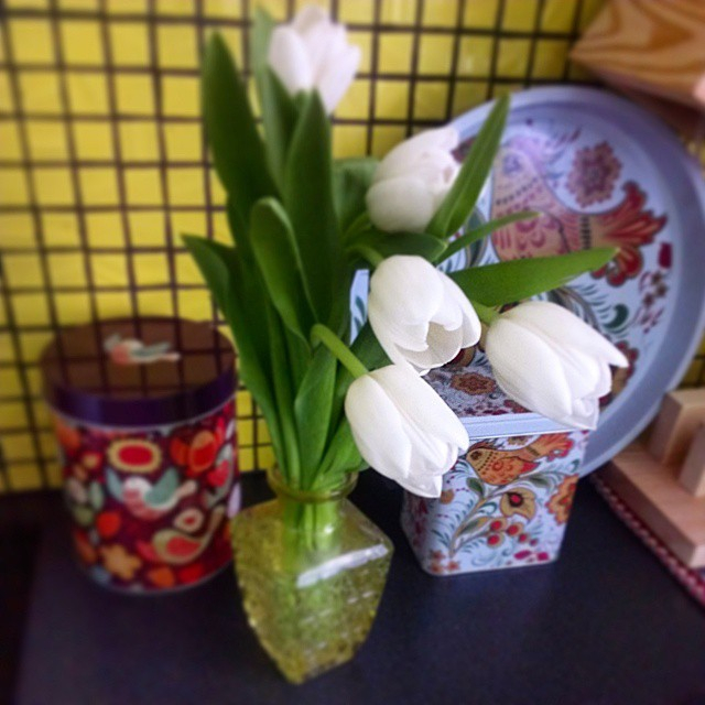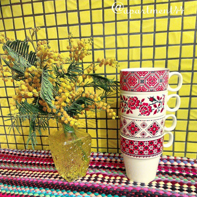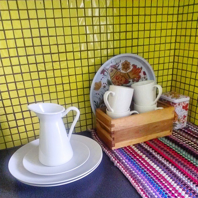 Эта жестяная пара поднос и банка для сыпучих мне очень нравится. Она, а еще этот плетенный коврик, неожиданно придали национального колорита нашей, и без того яркой кухне. Холодильник у нас планировался желтый, а стены у нас не планировались зелеными, но жизнь вносит свои коррективы:)