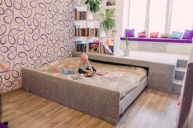 Посмотрите в Икеа каркасы кушетек, мне кажется стоит рассмотреть вариант заменить на нее кровать и скамью, и рядом поставить систему для игрушек. и попробуйте поменять полосы на обоях, плинтуса на другой цвет.