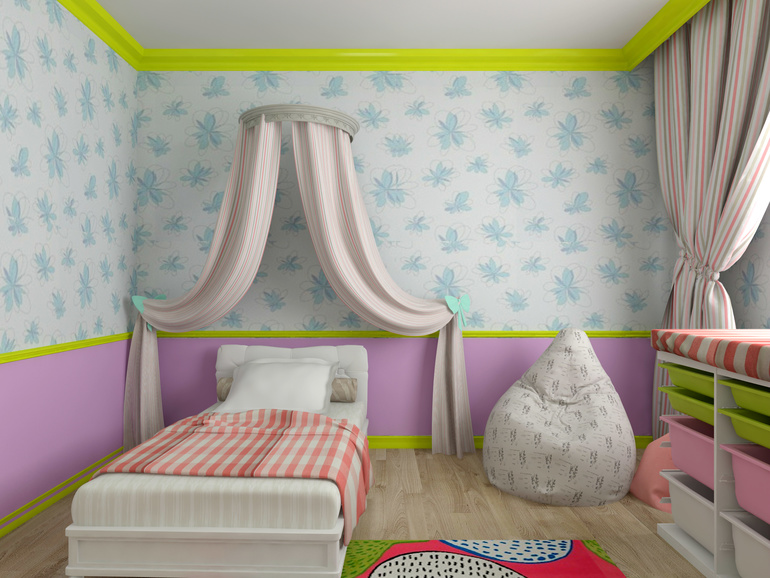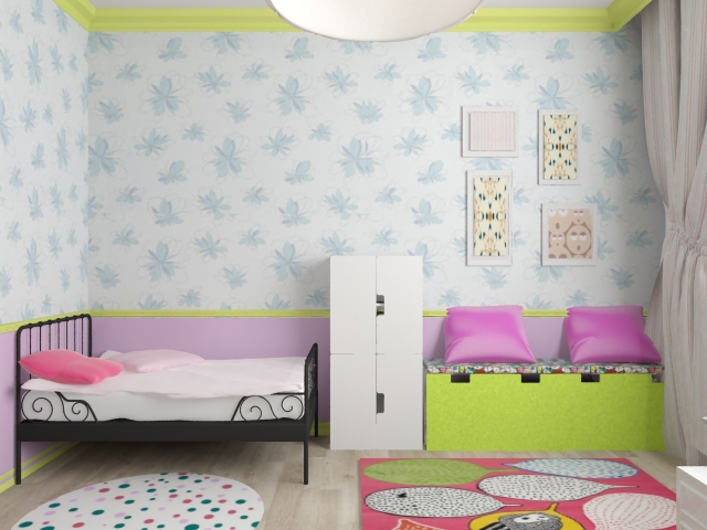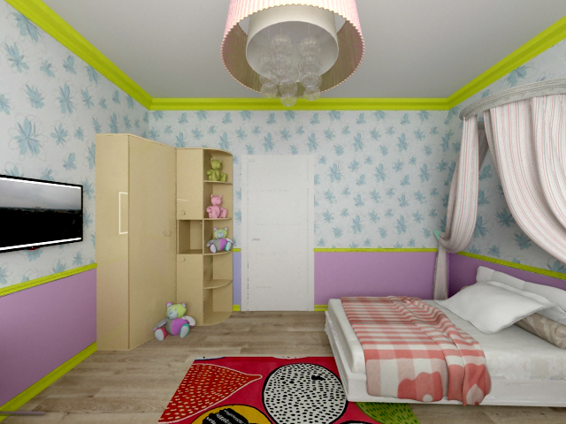 Извините, но с цветами на визуалке проблемы, цвет потолочного карниза, молдинга и плинтуса вообще не отсюда. И если вы отталкиваетесь от обоев с бабочками, то фиолетовый нужен более сложный, как бы приглушенный с меньшим процентом красного.