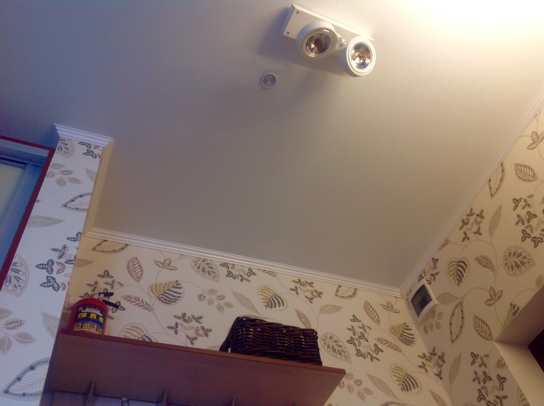 Потолок натяжной белый матовый. Светильники крутящиеся с направляемым светом. Очень удобно в деле как оказалось. Еще пожарный датчик - кругленькая решеточка на потолке.