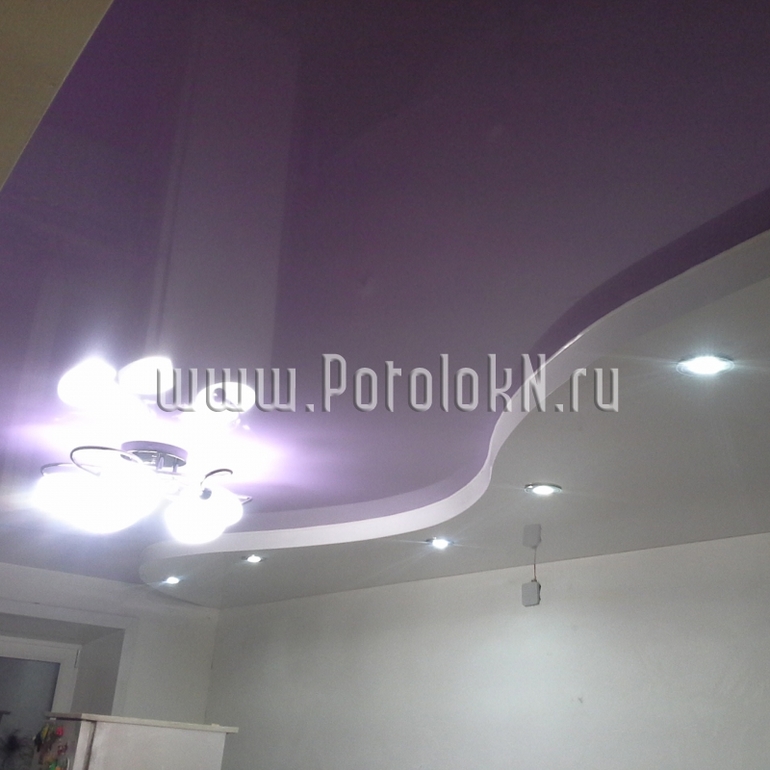 Все это, скажем так, дело вкуса. Белый матовый потолок - это классика и это не скучно, тк если повесить красивую люстру и сделать интересные акценты в интерьере, то все будет смотреться гармонично. Глянцевый потолок мне лично не нравится, тк смотрится не очень уютно, а цветной кроме как в детской, не побоюсь этого слова, пошло. Но у всех представления о прекрасном разные) единственное, подумайте не будет ли очень темно с фиолетовым потолком, ну и впоследствии если решите поменять цвет мебели и стен, придется и потолки менять. Белый в этом плане универсальный цвет. Может сделать гипсокартонную часть цветной? Ее хотя бы перекрасить потом можно.