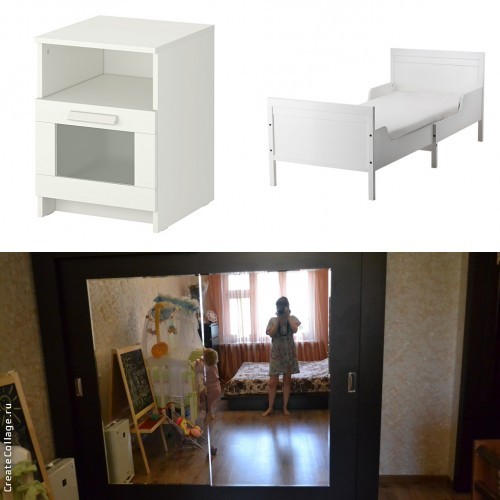В спальной зоне будет горе-шкаф, кроватка дочки Сундвик Икеа, кроватка сына (фото нет, обычная детская с реечками светло-бежевая), и посередине прикроватная тумба Бримнес.