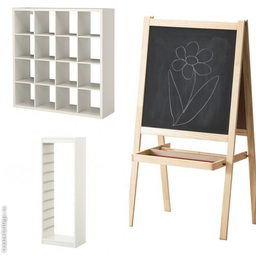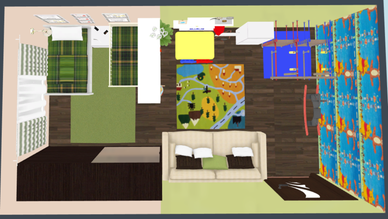 Решила зонировать комнату, на игровую и спальную зоны. Со стороны входа игровая зона, в ней будет ДСК Беби хит вип; столик и два стула (пока оставим старые, сине-красно-желтые, они как раз под цвет ДСК, потом поменяем на белые); над столиком белые полочки; комод Икеа Труфаст под всякие краски/карандаши и т.п.; мольберт, диван светло-бежевый (громоздкий, поменять бы на маленький, знаю, но не сейчас), и стеллаж Каллакс из Икеа (он и будет разделять зоны).