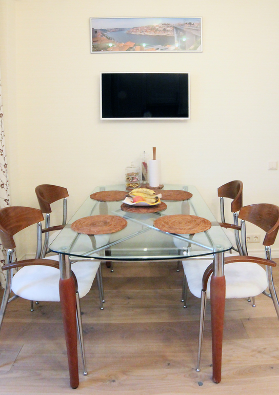 Столовая группа вполне устраивала по состоянию и качеству, и идеально подошла по цвету дерева. Зато сиденья были ярко синего цвета, что явно выбивалось из общей картины. Поэтому их мы переобили мягким моющимся флоком, ткань называется Velsoft. Проверено - отмывается абсолютно все!