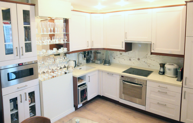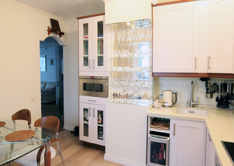 Идея сделать витрину для коллекции бокалов принадлежит заказчице Галине. Зеркала и стекло на фартук изготовили под заказ на Московской Зеркальной Фабрике.