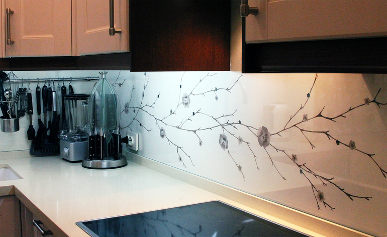 Когда мы вибирали в салоне ткань для штор с вышитыми ветками сакуры, родилась идея украсить фартук росписью с таким же рисунком. Сверху все закрыто стекляными скиналями, поэтому за сохранность рисунка можно не беспокоиться. на мой взгляд, художнице очень хорошо удалось сымитировать вышивку