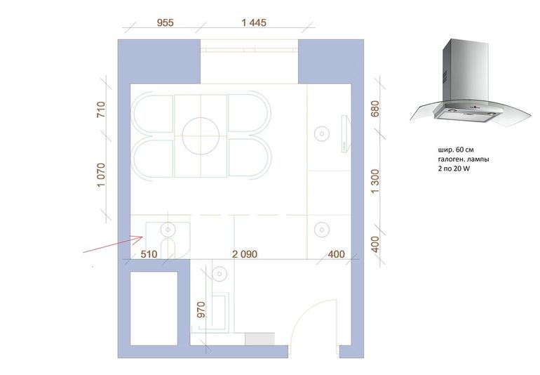 Я хочу расположить его так, как на схеме. Он расположен на высоте 280 см от пола, а вытяжка 180 см от пола. На самой вытяжке еще есть свет (2 галогенки по 20). Т.е.один метр высоты нормально освещает, в т.ч. и угол. А саму варочную - свет от встроенных от вытяжки. МУЖ хочет мой точечный светильник сдвинуть всторону, т.к. он будет давать тень на варочную.