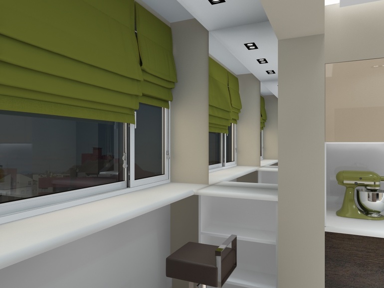 ну и балкон , решила все таки закрыть полки дверцами и моя мечта зеркало у окна , теперь можно спокойно красится при дневном цвете ) И столешница у балкона должна быть пошире , все таки это не широкий подоконник , а типа второй столешницы .