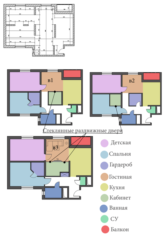 Кабинет вместо гостиной, в третьем варианте. Кабинет будет удален и у окна и гостиная в центе проветриваема, доступна. Естественно раздвижные двери переезжают, на другую сторону входа детской. Детская со спальней просятся поменяться. тк туалеты, ванны и вообще потише, поспокойнее кажется. Но это на чертеже, а в реале Вам решать конечно.