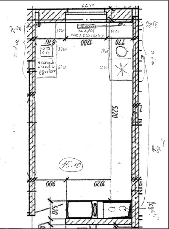 У нас будет кухня 15 квадратов, которую мы хотим совместить с гостинной. И мне в голову взбрело поставить кухню у окна. Получается огромная экономия места.