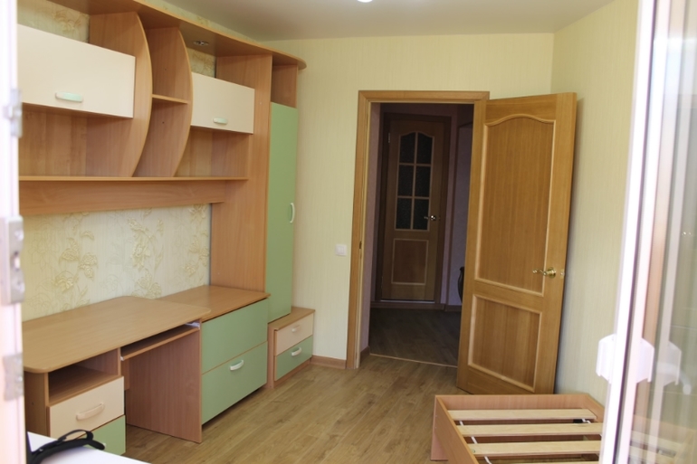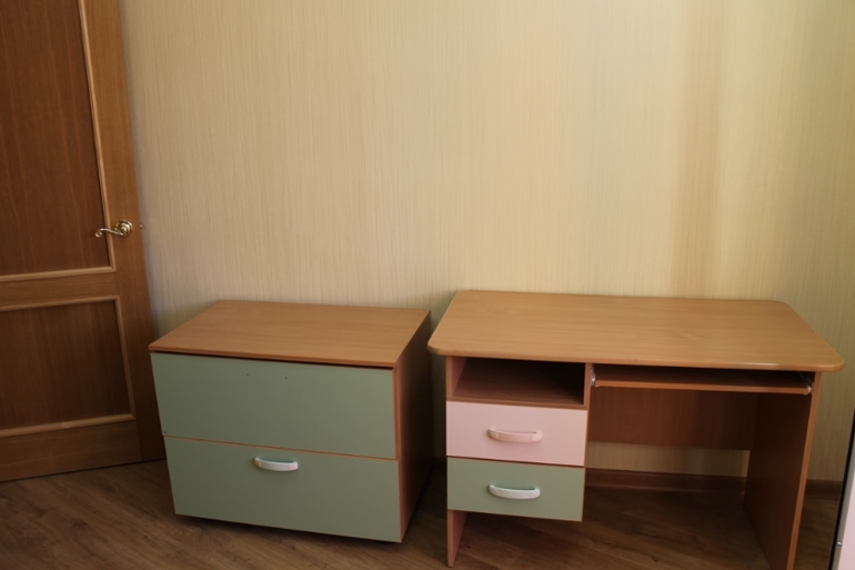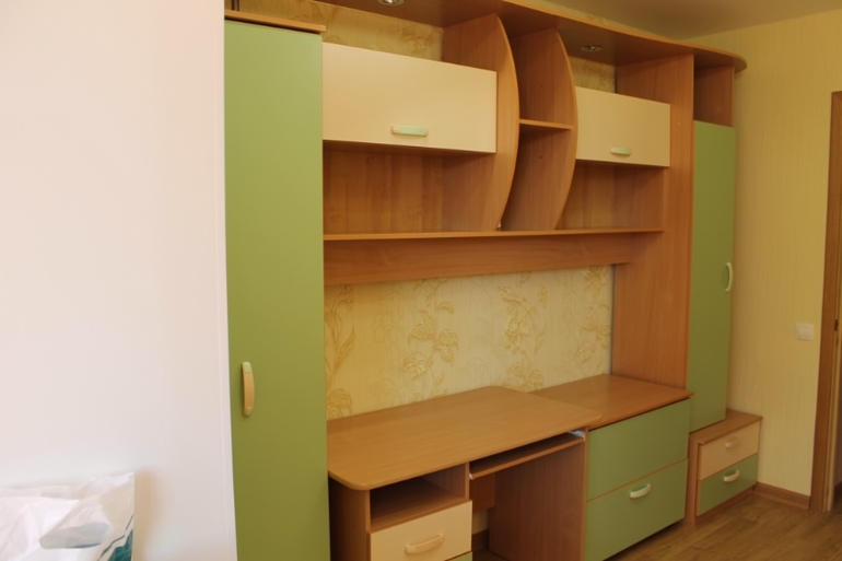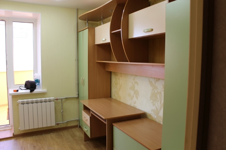 Интерьерное решение детской комнатыСнова к вам за помощь обращаюсь, хочеться поскорей заехать, но на новую детскую решили пока не тратиться и решили привезти и временно поставить старую...впихнулась миллиметр в миллиметр...но по эту стену я планировала лишь кровать и шкаф. т.к. обои с цветами закрывать не хотела.... Собрали мы с мужем детскую. крутили вертели ее...но что-то не так...или убирать ее вообще или оставить один из вариантов. Дочке 8 лет. конечно удобен вариант, когда стол под этой жуткой полкой. но тогда кровать у двери,....это не гуд((( Если кровать под полкой(страшно), то стол какой то сиротливый.... Что думаете, оставлять или один из вариантов все же оставить???