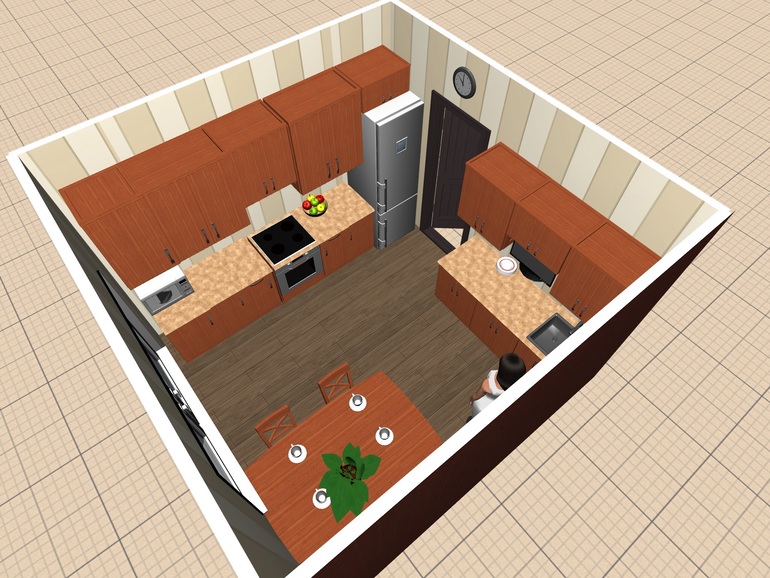 у меня на старой квартире было один в один! прям наша кухня))) даже цвет)))сделали так только из- за балконного блока! дверь окрывалась в сторону микроволновки!сейчас не могу ответить,почему -то тянули толстый шнур ,на полу под плиткой, для электрической плиты! соответственно уровень пола поднялся! телевизор стоял на невысоком холодильнике!угол тумбочки, возле двери был скошен! на верху шкафчик тоже был угловой! по растановке мебели никогда ничего не напрягало!