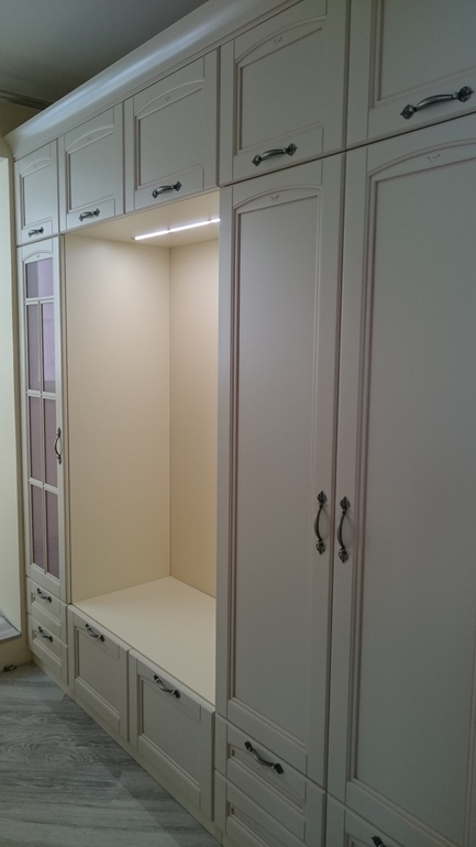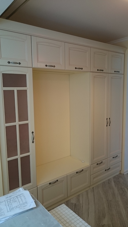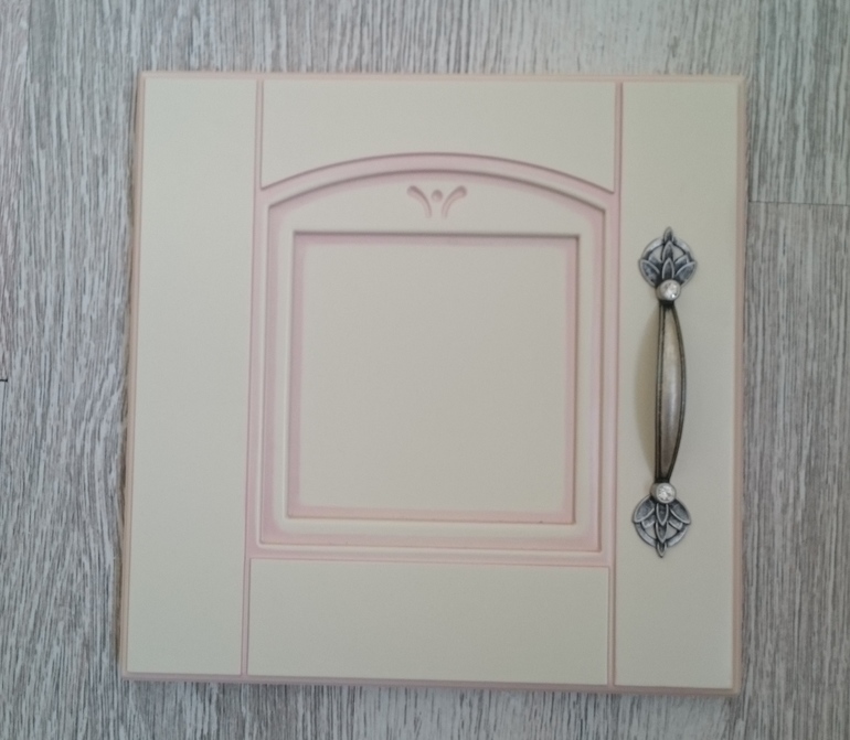Вот пробный фасад, который нам выкрасили и отдали специально, что бы подобрали ручки. Ванильный цвет, с розовой патиной.