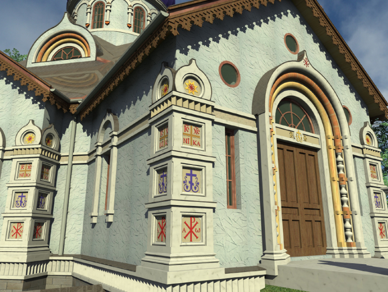 Стояла задача спроектировать небольшой сельский Храм на 200 человек. Была опасность, что он будет примитивным. Поэтому убрали колокольню с центральной оси в бок, а в основу композиции была положена 8-мигранная ротонда. Такое решение использовалось в Византийском зодчестве. А колокольня с правой стороны от входа - прием распространенный в нашей северной сельской архитектуре. Все вместе должно создавать впечатление уютного Храма в котором соединены Византийские и Владимиро-Суздальские влияния.