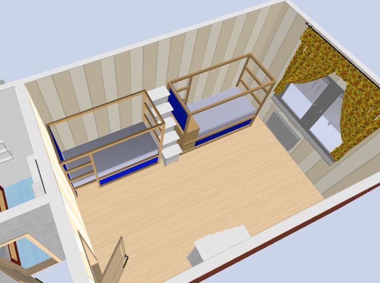 В комнате вдоль стены будут стоять 2 кровати чердака. Между кроватями будет лестница-стеллаж.