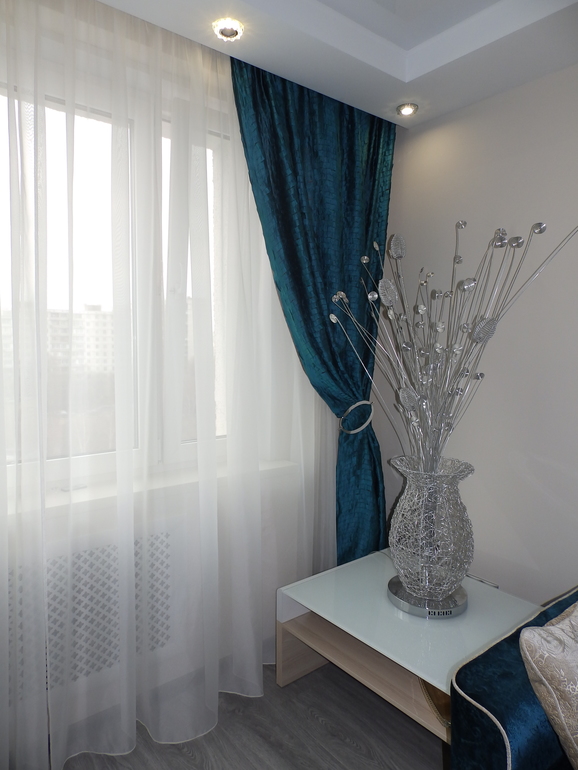 только облегченная портьера, из 2-х частей. на оконном блоке - рулонные шторы "Блэкаут"