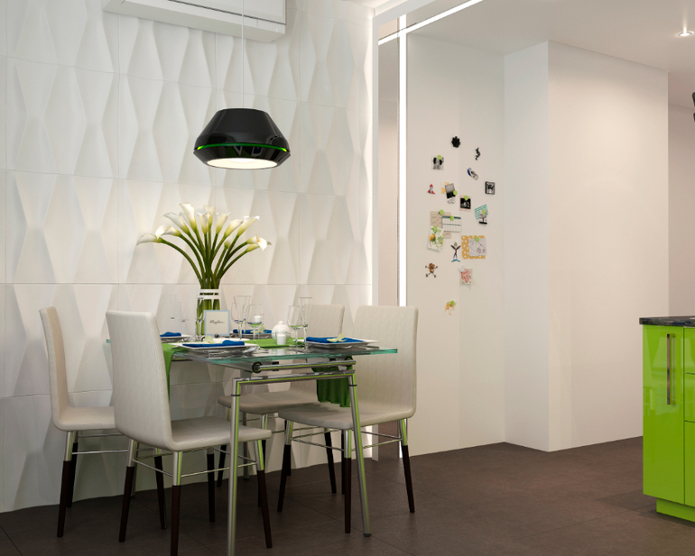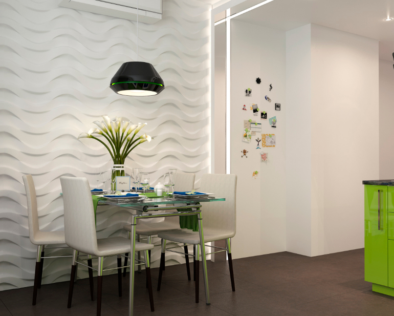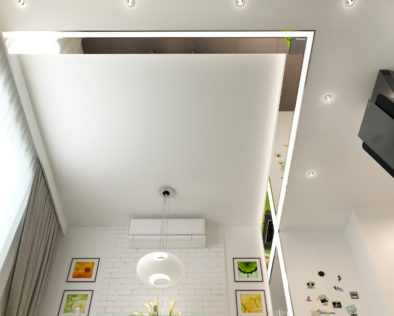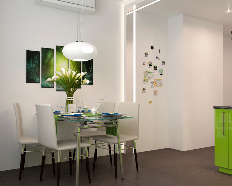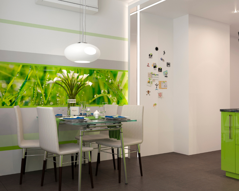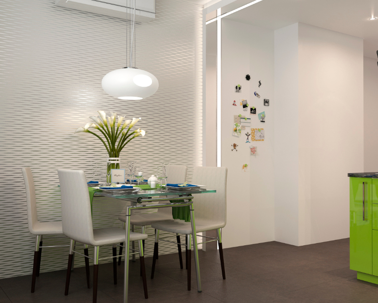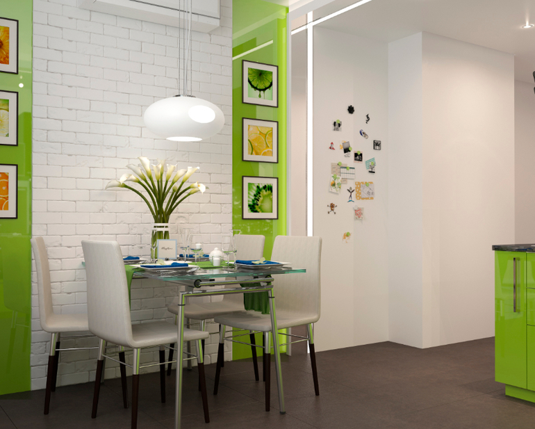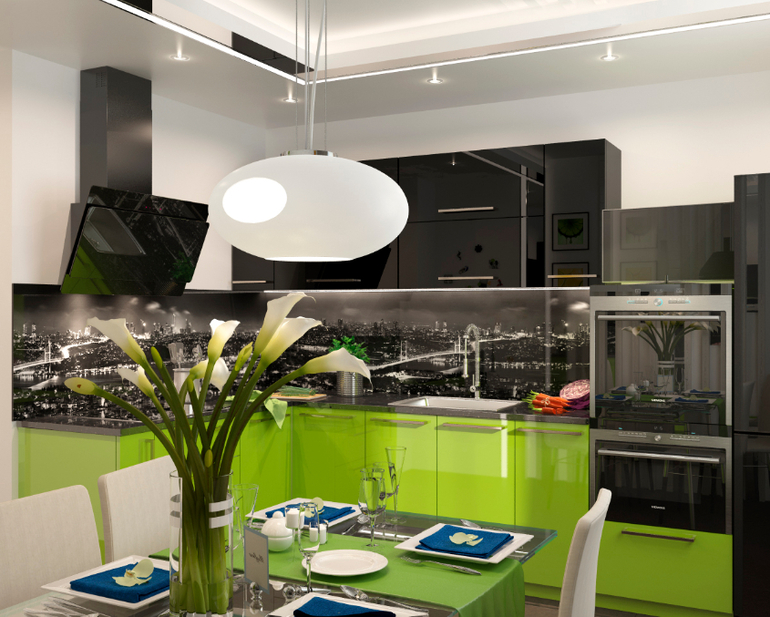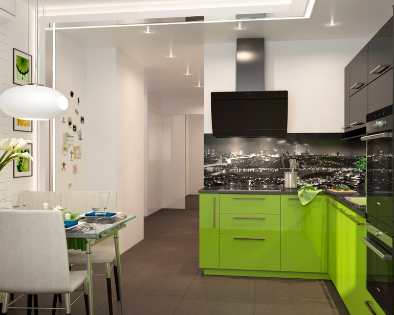 А вот итоговый утвержденный вариант кухни. И небольшое описание. Хозяева квартиры -молодые активные ребята, так что агрессивное сочетание черного и салатового ни капли их не смутило. Кухня получилась яркая и броская. Черная бытовая техника дополняет ансамбль. Стена с обеденным столом, в противовес активной кухне, полностью белая, но с разными фактурами. Из путешествий часто приезжают разнообразные магнитики, так что им тоже необходимо было уделить место. Решено было покрасить стену краской с магнитными свойствами. Таким образом под магнитики была отдана целая стена справа от входа. С потолка на стену переходит широкая зеркальная полоса, пущенная по периметру закарнизной подсветки.
