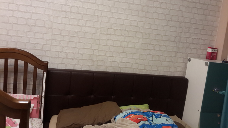 В большой комнате, по стене, где дверь, поклеила кирпичные обои ..че-то на фото прямо стыки видно, вживую не так заметно. в любом случае стена будет завешана разноцветными рамочками с фото