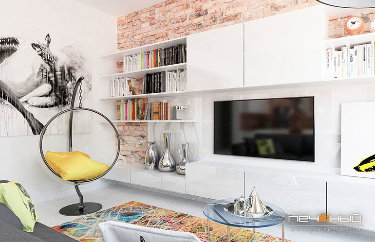 Нечасто встретишь сразу две кирпичные стены в комнате, обычно в качестве акцентной мы делаем одну. Однако здесь позволяла площадь, да и открытых поверхностей не так уж много: в кухонной зоне киприч с большего скрыт шкафами, а в зоне гостинной - стеллажом. На этой картинке можно заметить шторы разных цветов - один из удобных приёмов при зонировании пространства с двумя окнами.